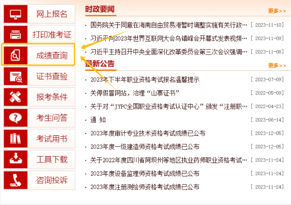 第一步:进入中国人事考试网(http://c.nxw.so/dex8t),点击左侧成绩查询栏目,进入成绩查询页面。