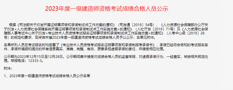 根据《司法部关于印发开展证明事项告知承诺制试点工作方案的通知》(司发通〔2019〕54号)、《人力资源社会保障部办公厅关于印发<人力资源社会保障系统开展证明事项告知承诺制试点工作实施方案>的通知》(人社厅发〔2019〕71号)及《人力资源社会保障部人事考试中心关于印发<专业技术人员资格考试报名证明事项告知承诺制试点工作实施方案>的通知》(人考中心函〔2019〕26号)的规定和要求,现将吉林省2023年度一级建造师资格考试成绩合格人员予以公示,名单见附件。