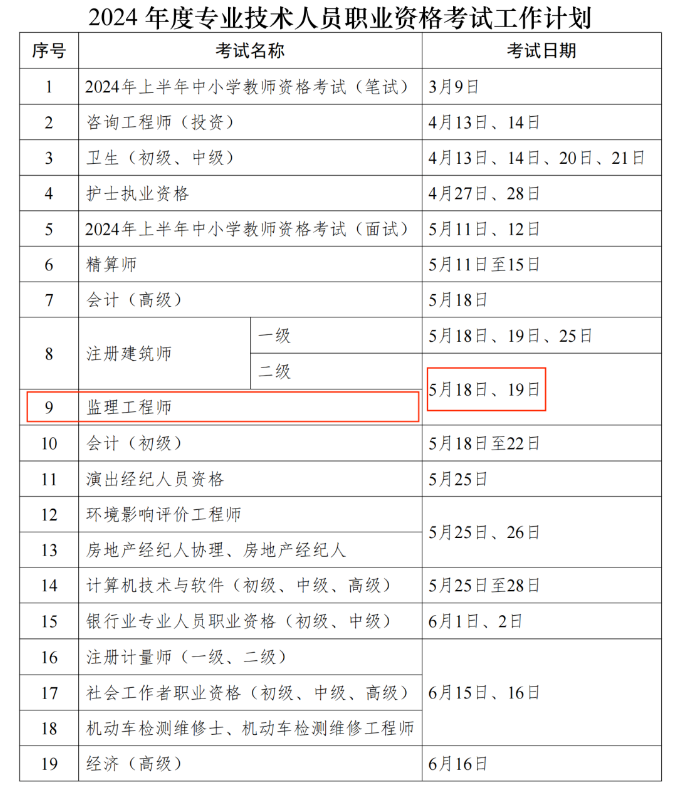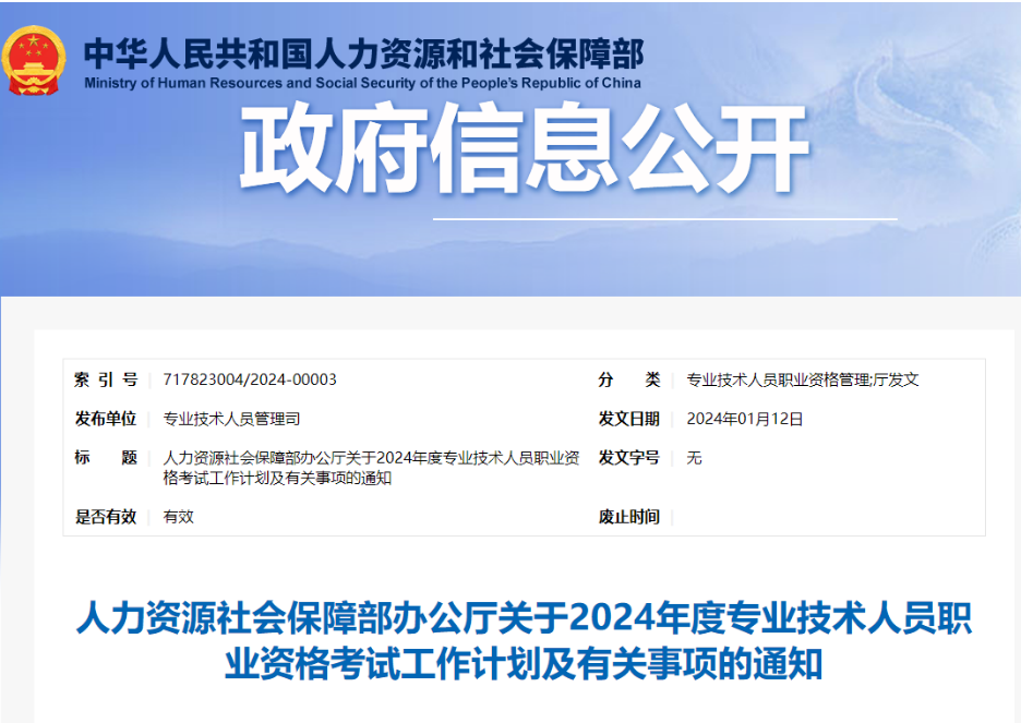 2024-01-17【平地起直聘讯2024年01月17日讯】刚刚!人社部官方发布《关于2024年度专业技术人员职业资格考试工作计划及有关事项的通知》,一建等各项考试时间定了!