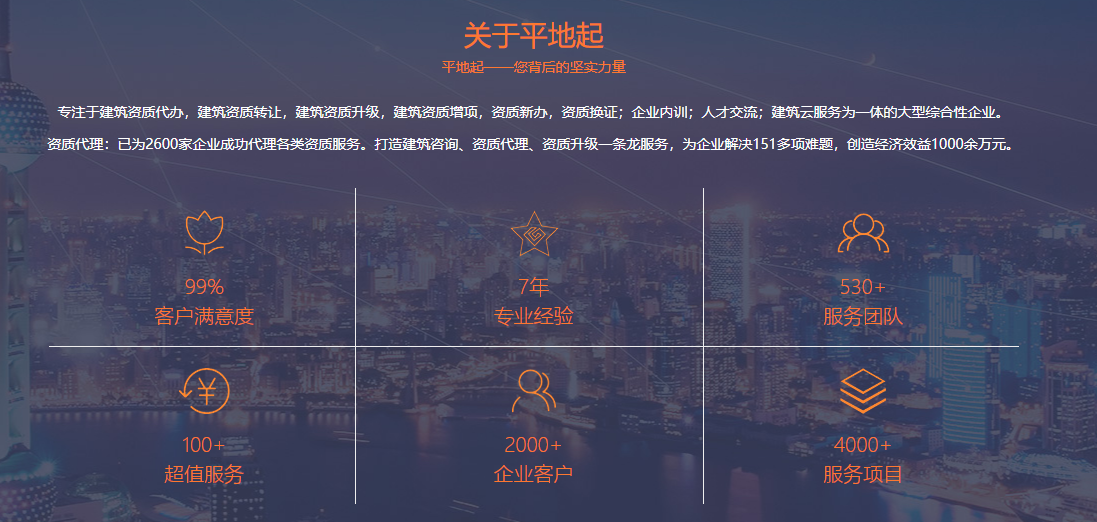 关于平地起专注于建筑资质代办,建筑资质转让,建筑资质升级,建筑资质增项,资质新办,资质换证;企业内训;人才交流;建筑云服务为一体的大型综合性企业。遇到问题让我们帮您解决!雄厚资金安全有保障,具备资质公司超500+,业务立足广东,辐射全国。企业办理资质申请入口:http://c.nxw.so/7nlE7,点击链接获取相关资质资质方案。