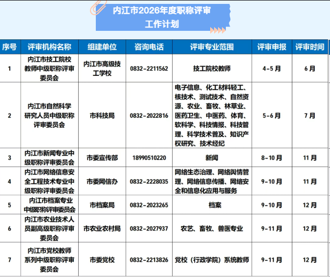 2026-03-042026年度内江市申报职称评审的专业技术人员,请及时关注并查看各职称评审委员会评审通知。查看路径,进入“四川省职称评审信息系统”——“通知公告”栏目或进入“内江市专业技术人员继续教育网”-“职称评审”栏目(四川省职称评审系统的官方网址为:(https://sl.pidiqi.com/fYvIJ3)。相关信息如下: